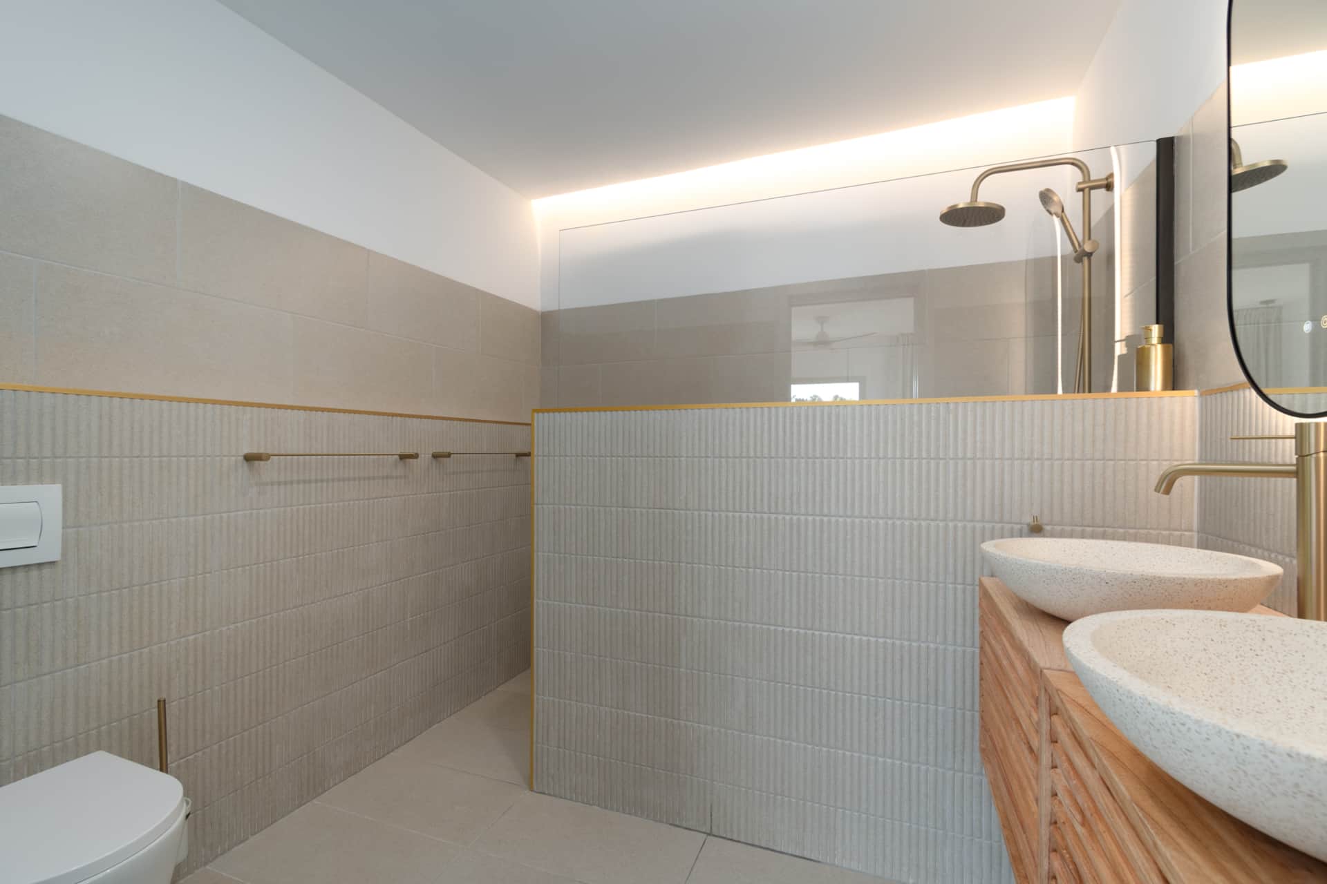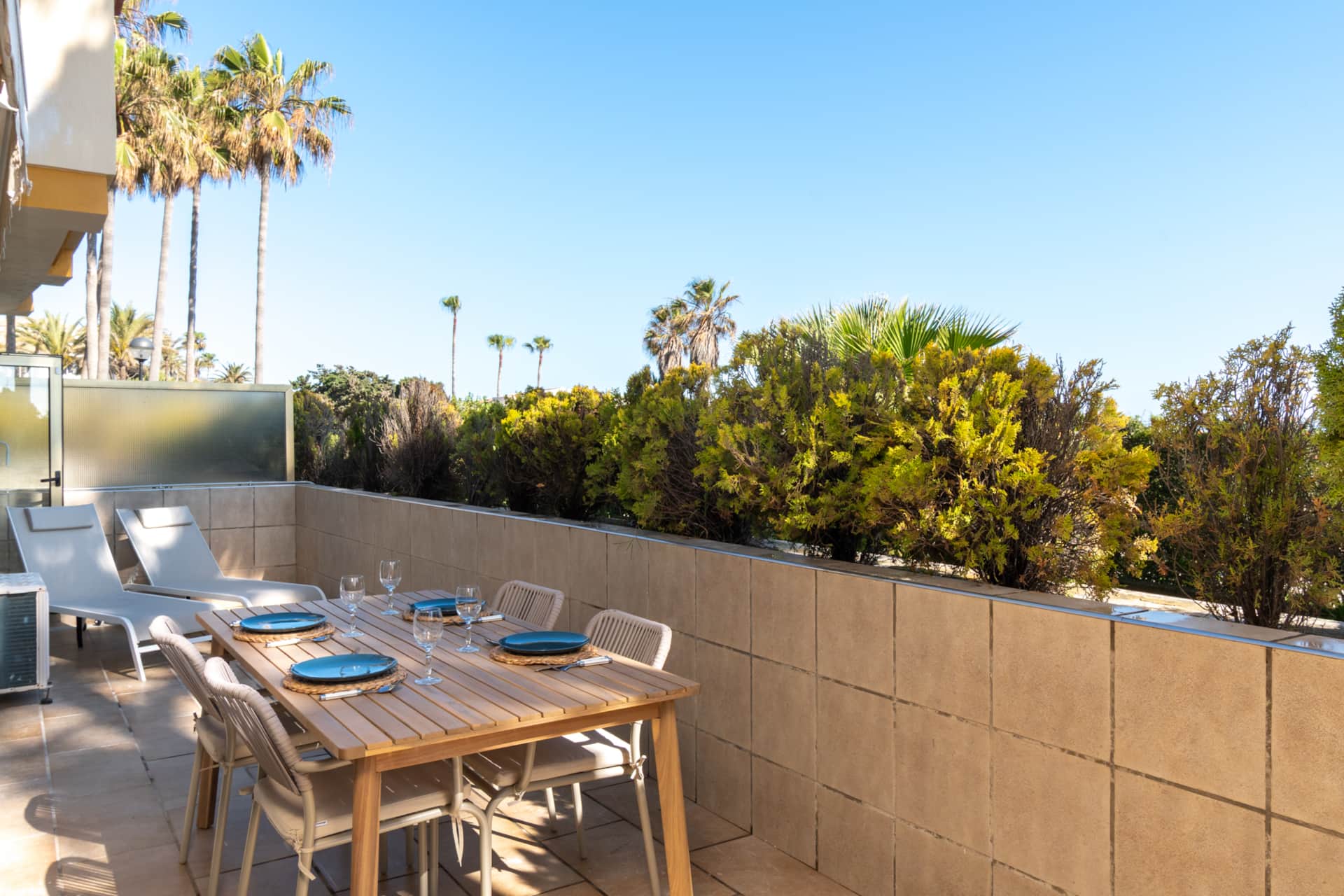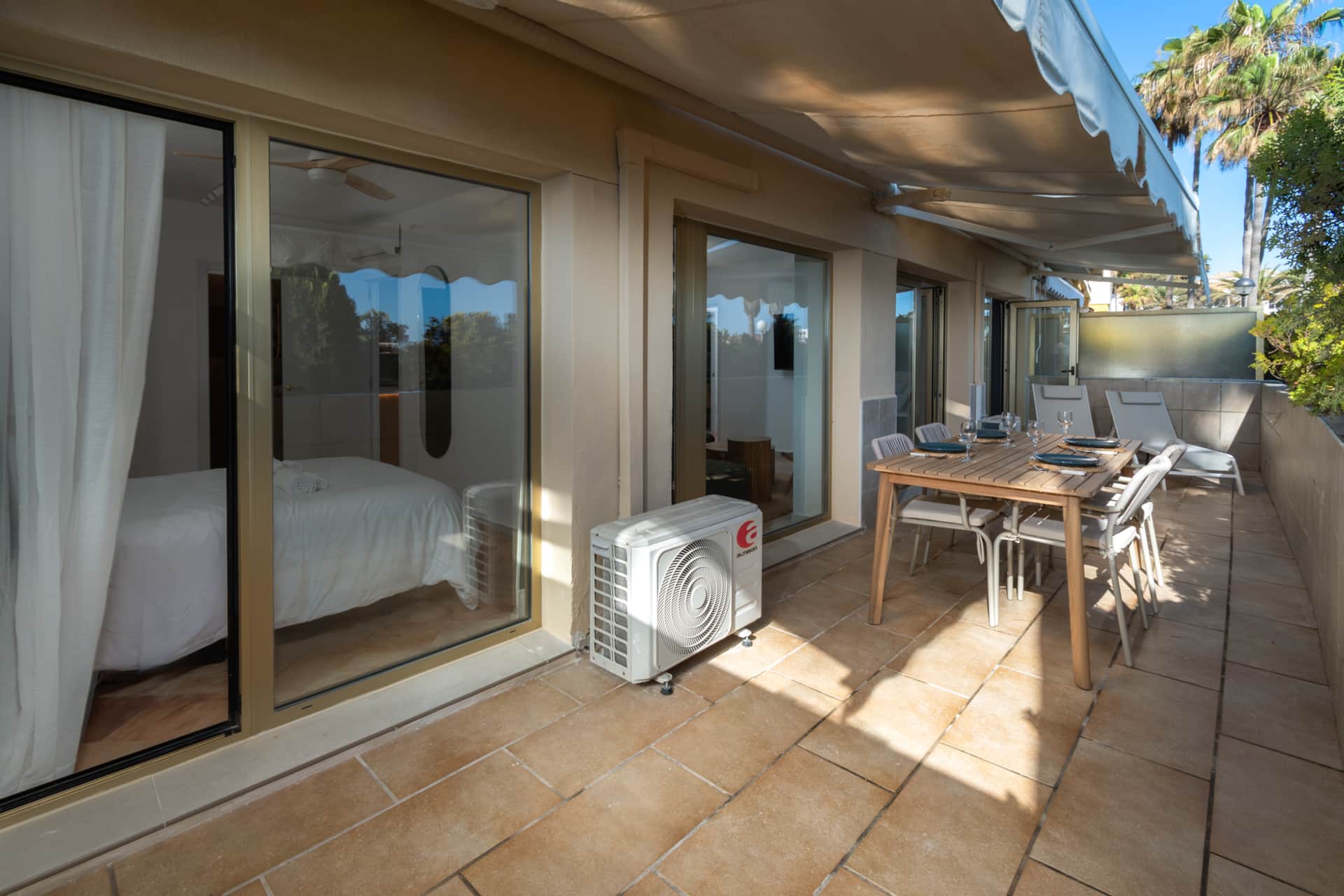 Inside, the apartment has been freshly renovated with a unique, modern aesthetic that blends natural textures and clean lines to create a calm, beach-inspired atmosphere. It features two stylish bedrooms, each with its own full ensuite bathroom and direct access to the terrace. The fully equipped kitchen has everything you need for home-cooked meals, while the open-plan living and dining area includes a generous, ultra-comfy sofa where you can stretch out after a beach day, curl up with a book, or gather for a cozy movie night. Air conditioning is installed through the house.
